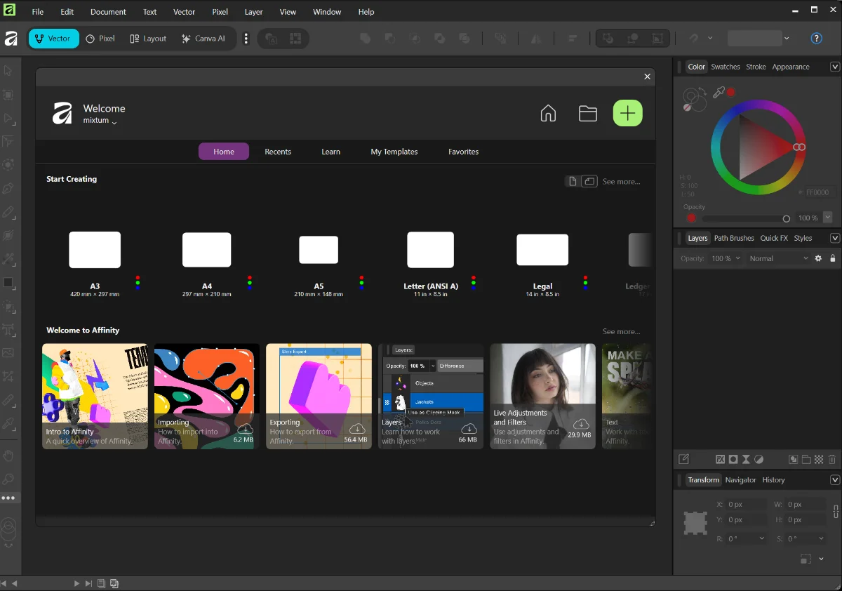 Affinity on vuosien ajan ollut yksi harvoista vakavasti otettavista Adobe-vaihtoehdoista. Sen vahvuuksia ovat nopeus, helppous ja se, että saman sovelluksen avulla voit tehdä sekä kuvankäsittelyä, vektoripiirtämistä että taittotöitä.